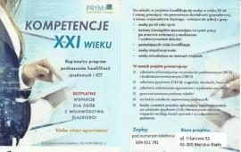 Udział w projekcie KOMPETENCJE XXI WIEKU umożliwia bezpłatne podniesienie kwalifikacji z zakresu ICT i językowych (tj. angielskiego niemieckiego, francuskiego) osobom pracującym, w wieku powyżej 25 lat z wykształceniem maksymalnie średnim.