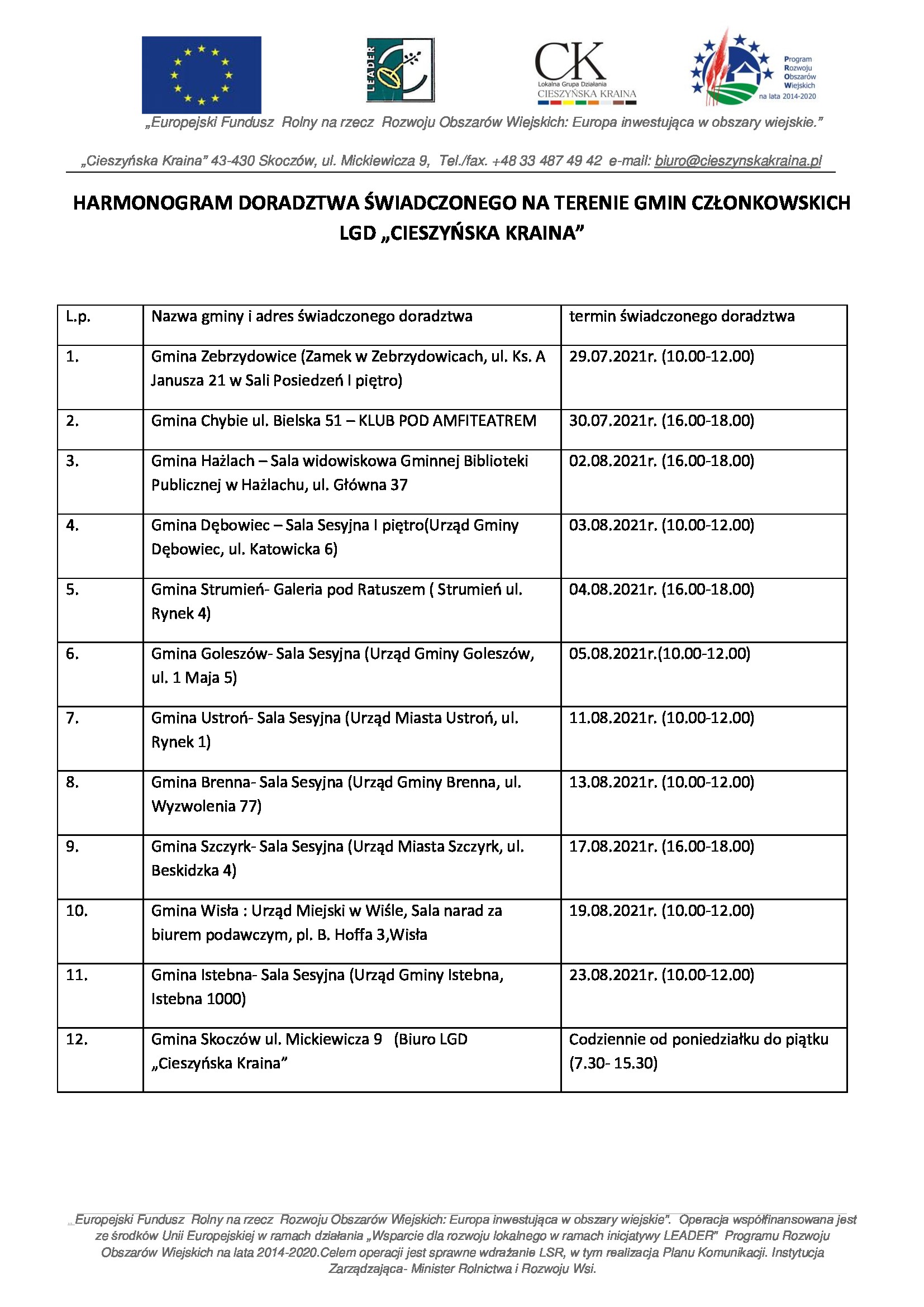 HARMONOGRAM DORADZTWA ŚWIADCZONEGO NA TERENIE GMIN CZŁONKOWSKICH LGD "CIESZYŃSKA KRAINA"