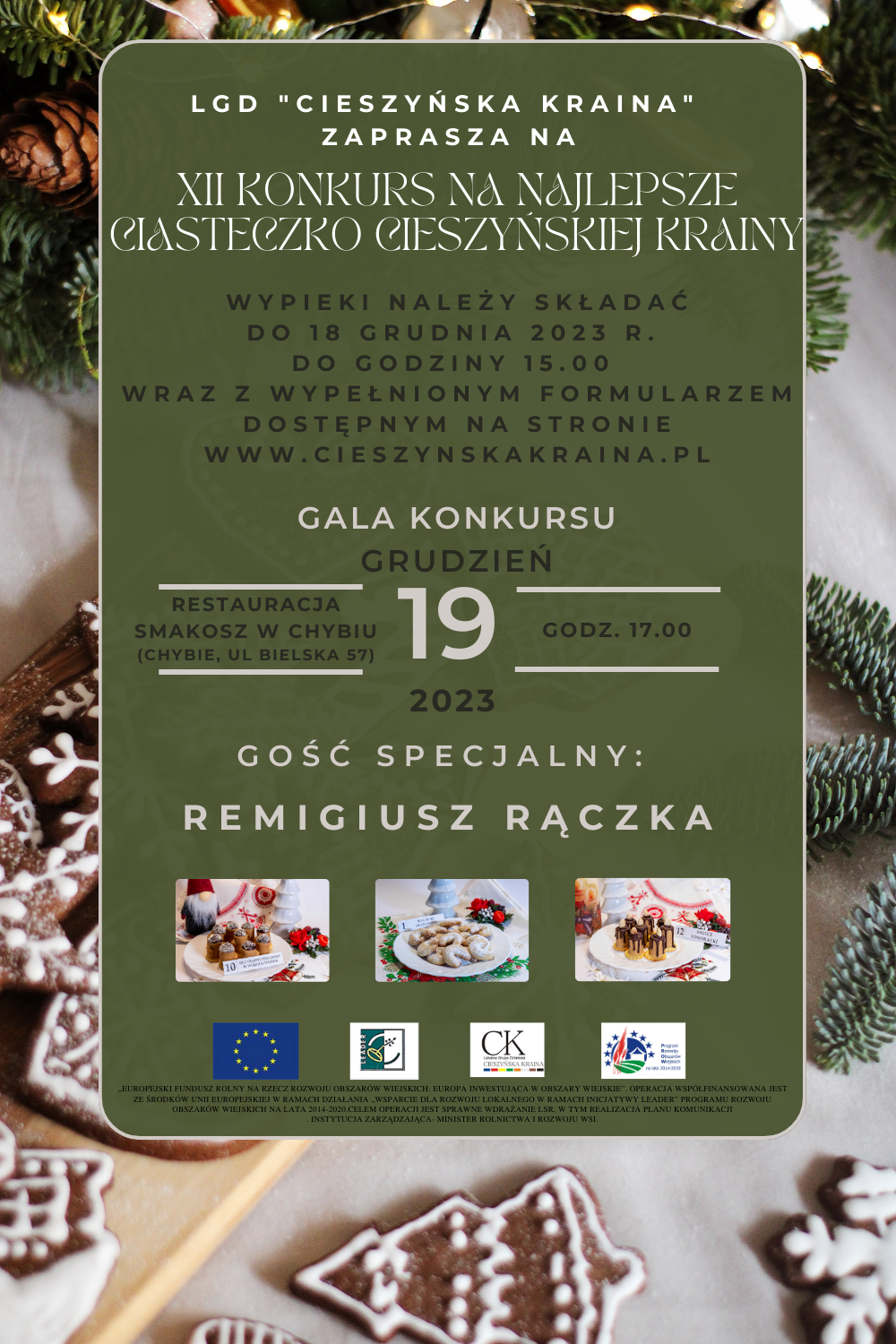 Stowarzyszenie Lokalna Grupa Działania "Cieszyńska Kraina" serdecznie zaprasza do udziału w XII konkursie na: Najlepsze Ciasteczko Cieszyńskiej Krainy. W konkursie może wziąć udział każda pełnoletnia osoba/podmiot zamieszkująca lub mająca siedzibę na terenie LGD, tj. Gminy Brenna, Chybie, Dębowiec, Goleszów, Hażlach, Istebna, Skoczów, Strumień, Szczyrk, Ustroń, Wisła, Zebrzydowice.