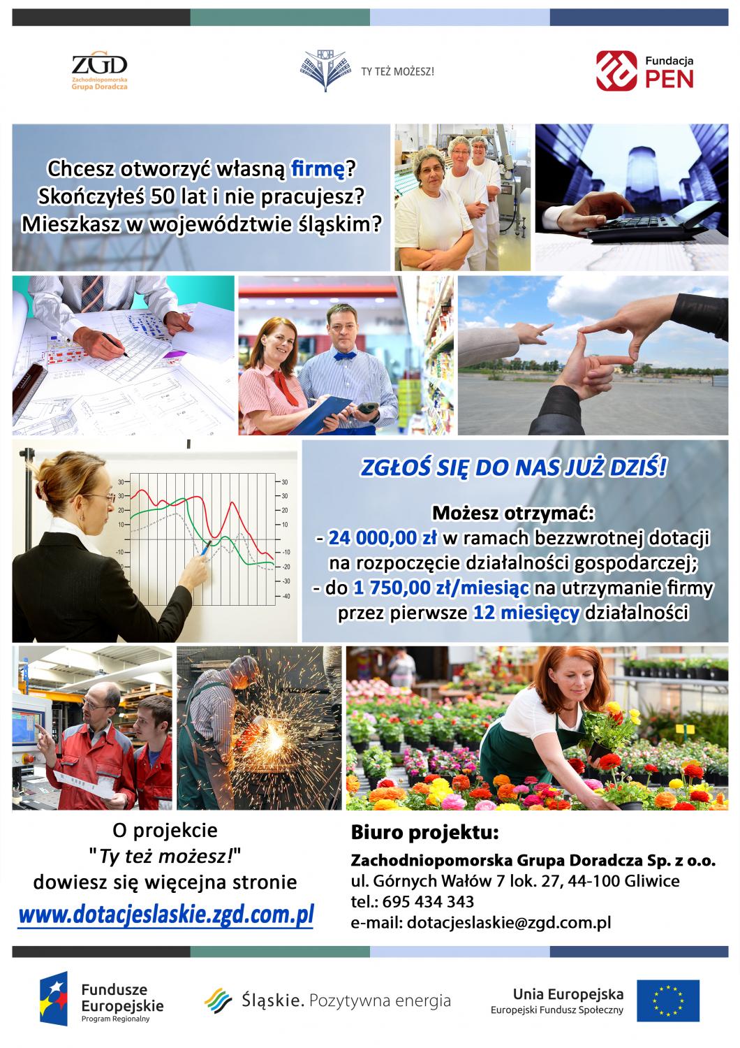 Informujemy, że Zachodniopomorska Grupa Doradcza Sp. z o.o oraz Fundacja Wspierania Przedsiębiorczości, Ekologii i Nauki w dniach 25 kwietnia 2017 – 20 maja 2017 będą prowadziły nabór do projektu „Ty Też Możesz! – wsparcie na rozwój przedsiębiorczości dla osób w wieku 50+ z obszaru Województwa Śląskiego”